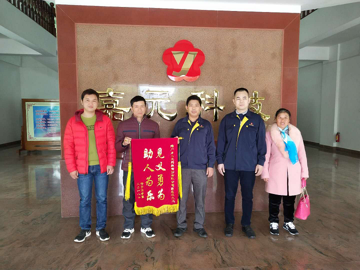 2019年1月3日上午,梅縣區(qū)丙村鎮(zhèn)群眾鄒明華夫婦,帶著一面繡有“救死扶傷·見(jiàn)義勇為”的錦旗送到廣東嘉元科技股份有限公司員工接送車(chē)駕駛員薛小林手中,以深深的感謝薛小林對(duì)其兒子鄒貴寶的救命之恩。