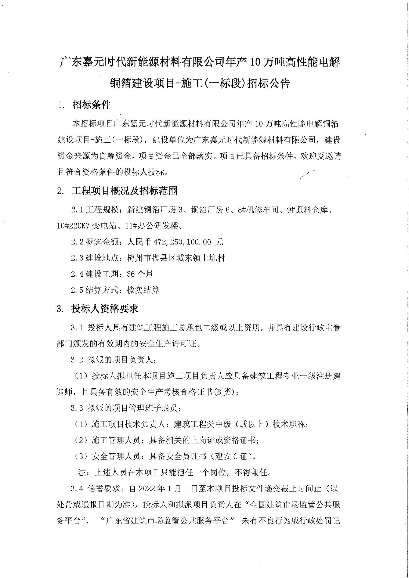廣東嘉元時(shí)代新能源材料有限公司年產(chǎn)10萬(wàn)噸高性能電解銅箔建設(shè)項(xiàng)目-施工(一標(biāo)段)招標(biāo)公告