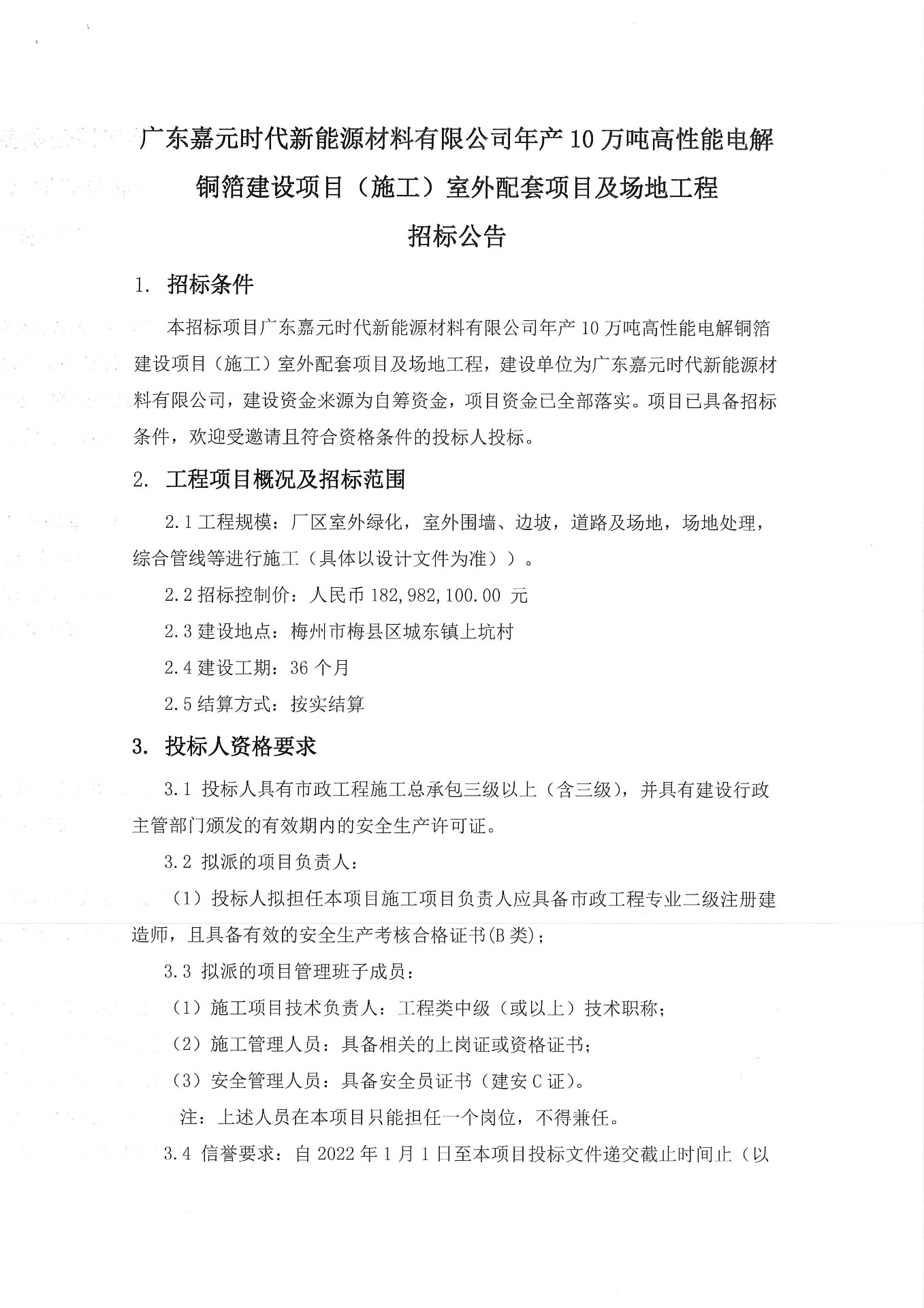 廣東嘉元時(shí)代新能源材料有限公司年產(chǎn)10萬噸高性能電解銅箔建設(shè)項(xiàng)目(施工)室外配套項(xiàng)目及場地工程招標(biāo)公告