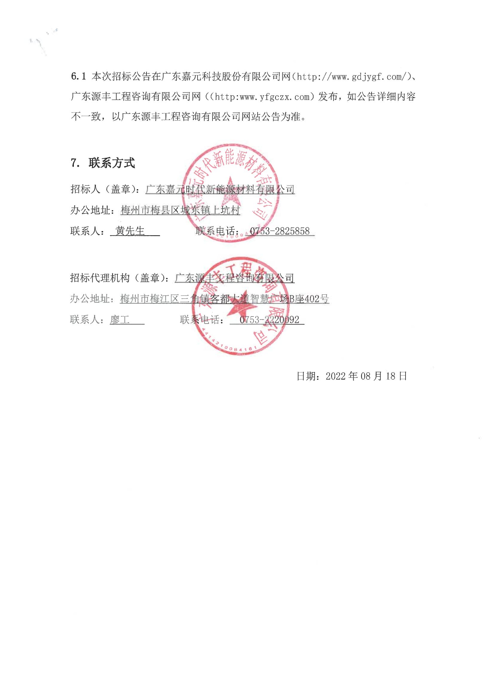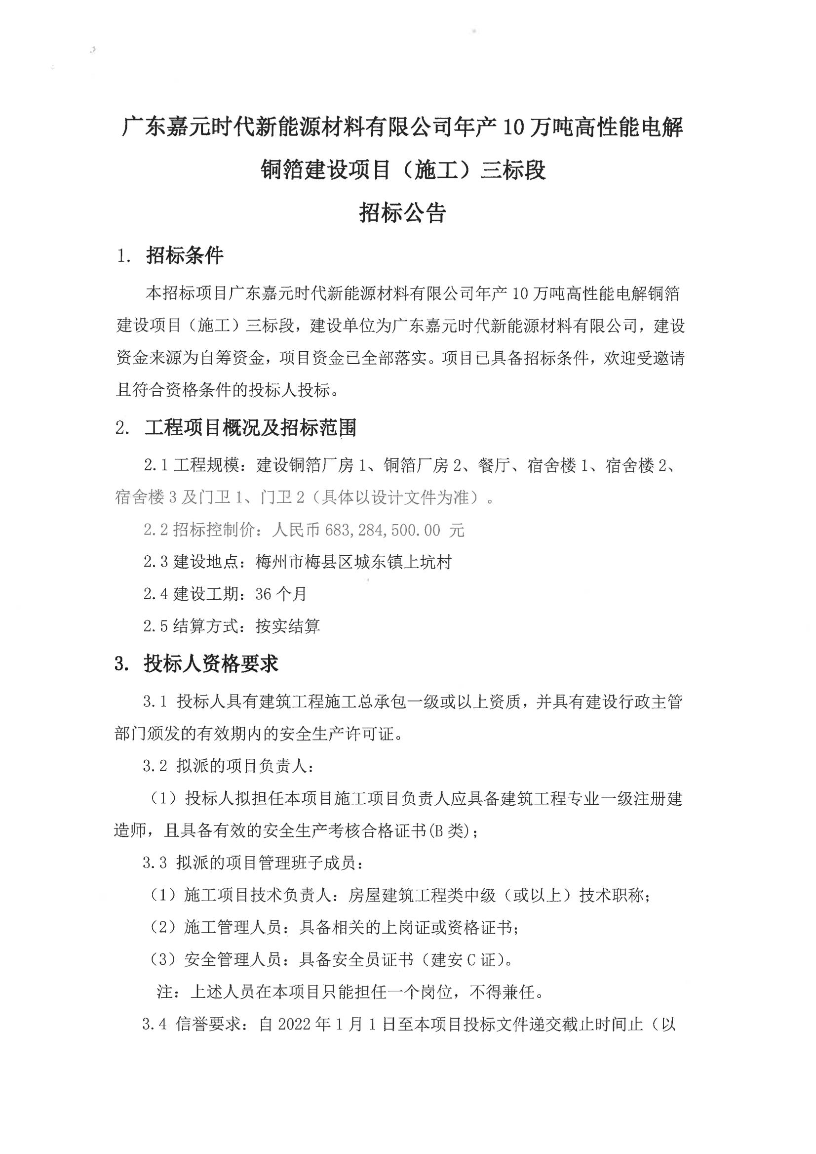 廣東嘉元時代新能源材料有限公司年產(chǎn)10萬噸高性能電解銅箔建設(shè)項目(施工)三標(biāo)段招標(biāo)公告
